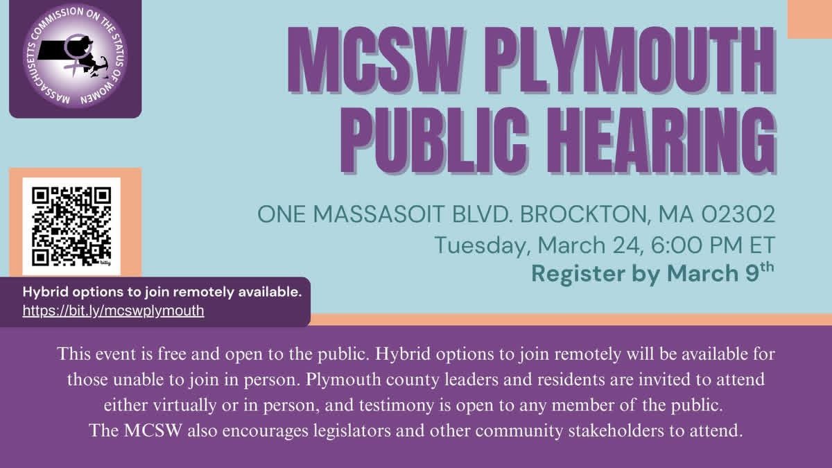 The Massachusetts Commission on the Status of Women (MCSW) invites Plymouth County residents, leaders, and community members to attend a public hearing to share perspectives on issues affecting women and families across the region.